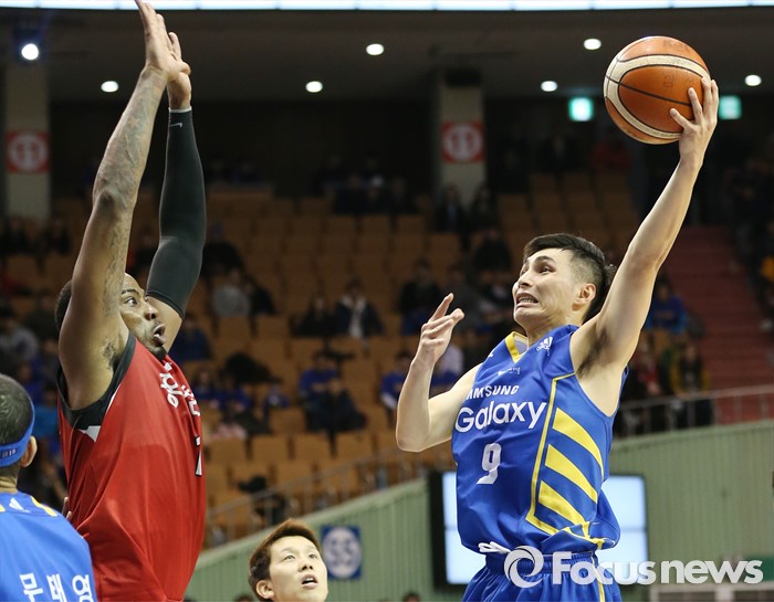 (서울=포커스뉴스) 2일 서울 잠실실내체육관에서 열린 2015-2016 프로농구 삼성-KGC 6강플레이오프 4차전에서 삼성 가드 주희정이 KGC 장신 센터인 찰스 로드의 수비 앞에서 레이업슛을 쏘고 있다.