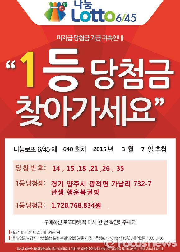(서울=포커스뉴스) 복권통합수탁사업자 나눔로또는 지난해 3월 7일 추첨한 제640회차 로또 1등과 2등 당첨자가 아직까지 나타나지 않았다고 3일 밝혔다.
