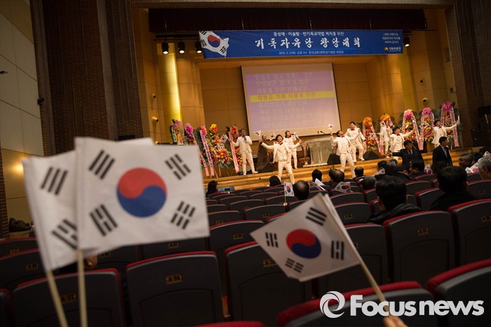 (서울=포커스뉴스) 3일 오후 서울 종로 한국기독교100주년 기념관에서 열린 기독자유당 창당대회에서 참가자들이 축하 공연을 하고 있다.
