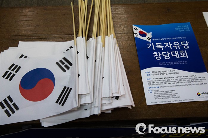 (서울=포커스뉴스) 3일 오후 서울 종로 한국기독교100주년 기념관에서 열린 기독자유당 창당대회에서 태극기와 창당대회를 알리는 책자가 함께 놓여 있다.