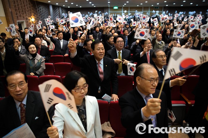 (서울=포커스뉴스) 3일 오후 서울 종로 한국기독교100주년 기념관에서 열린 기독자유당 창당대회에서 참가자들이 창당을 기념하며 태극기를 흔들고 있다.
