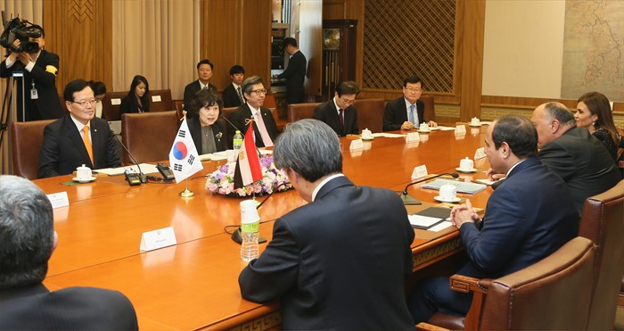 (서울=포커스뉴스) 정의화 국회의장이 3일 오후 서울 여의도 국회 접견실에서 압델 파타 알시시(Abdel Fattah Al-Sisi) 이집트 대통령을 접견, 양국 우호 협력관계 증진 방안 등에 대해 논의하고 있다. <사진제공=국회>