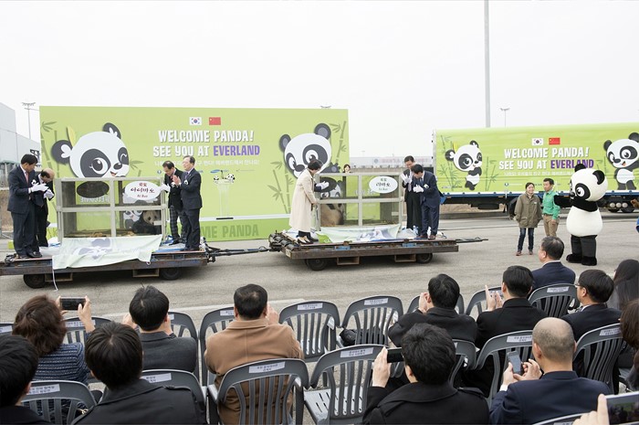 (서울=포커스뉴스) 중국 청두 공항을 출발해 3일 오후 인천공항으로 입국한 판다 러바오(수컷)와 아이바오(암컷)가 공개되고 있다. <사진제공=삼성물산>