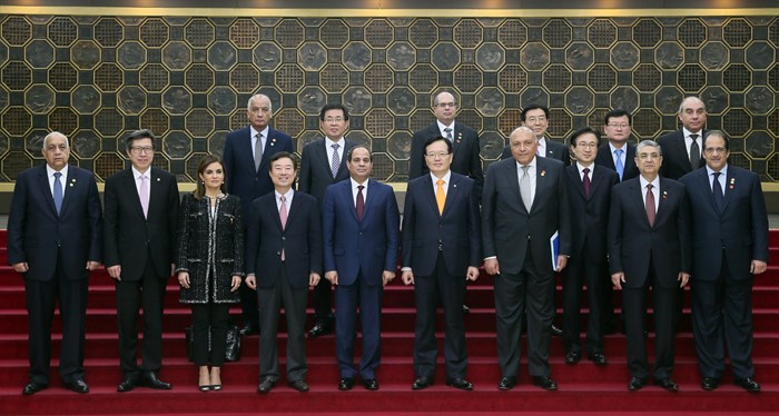 (서울=포커스뉴스) 정의화(앞줄 오른쪽 다섯번째) 국회의장이 3일 오후 서울 여의도 국회 접견실에서 압델 파타 알시시(Abdel Fattah Al-Sisi, 앞줄 왼쪽 다섯번째) 이집트 대통령 일행을 접견, 양국 우호 협력관계 증진 방안 등에 대해 논의한 뒤 기념촬영을 하고 있다. <사진제공=국회>