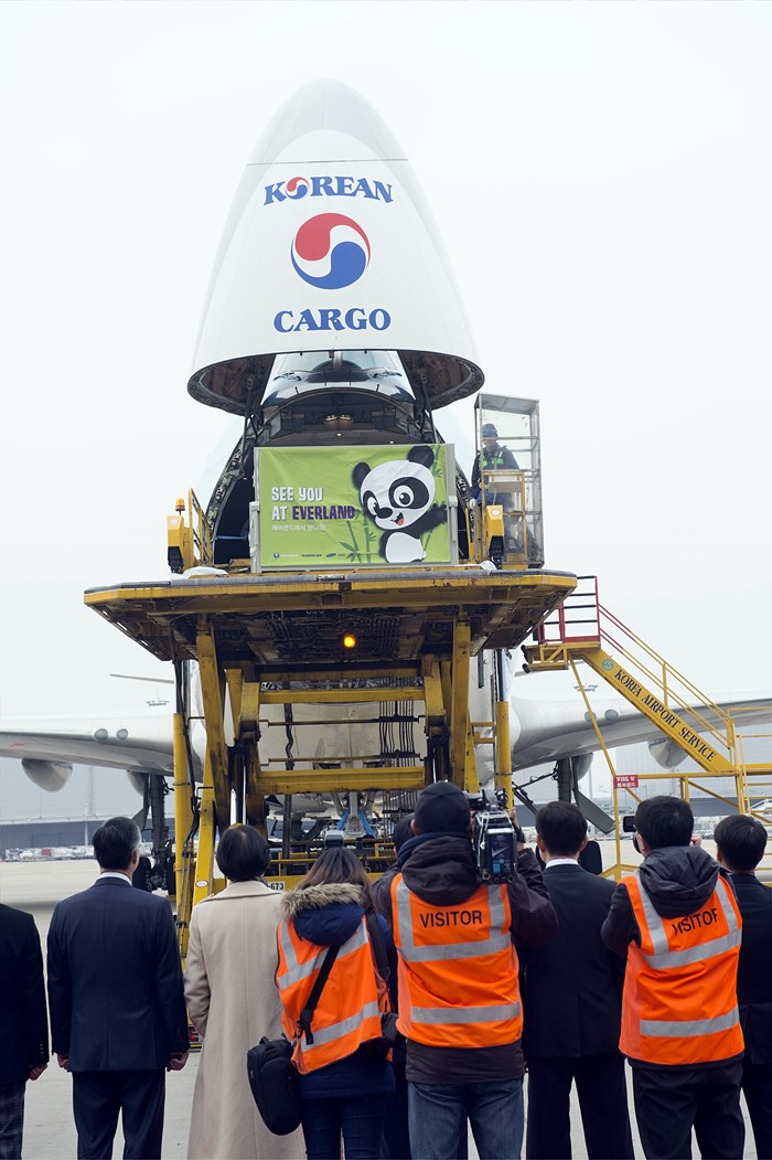 (서울=포커스뉴스) 판다 러바오(수컷)와 아이바오(암컷)가 중국 청두공항을 출발해 3일 오후 인천공항 화물터미널로 도착하고 있다. <사진제공=삼성물산>