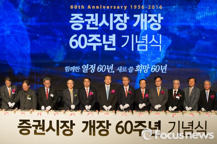 (서울=포커스뉴스) 3일 오후 서울 영등포구 63빌딩에서 증권시장 개장 60주년 기념식에 참석한 내빈들이 떡케익 커팅식 전 포토타임을 갖고 있다. 왼쪽 다섯번째부터 진웅섭 금융감독원 원장, 김무성 새누리당 대표, 임종룡 금융위원장, 최경수 한국거래소 이사장.