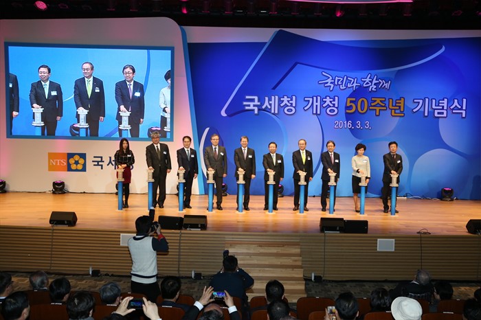 (세종=포커스뉴스) 3일 오후 세종시 정부세종 2청사 국세청에서 열린 '성실납세 감사 행사 및 개청 50주년 기념식'에서 임환수 국세청장과 내빈들이 축하 퍼포먼스를 하고 있다. <사진제공=국세청>