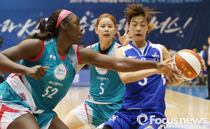 (구리=포커스뉴스) 3일 구리시체육관에서 열린 2015~2016 여자프로농구 KDB생명- KEB하나 경기에서 KDB생명 이경은의 볼을 KEB하나 첼시 리가 가로채려 시도하고 있다.