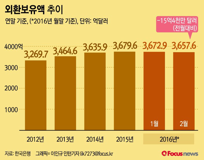 (서울=포커스뉴스)4일 한국은행이 발표한 '2016년 2월 말 외환보유액'을 보면 지난달 외환보유액은 3657억6000만달러로 1월 말보다 15억4000만달러 줄었다.