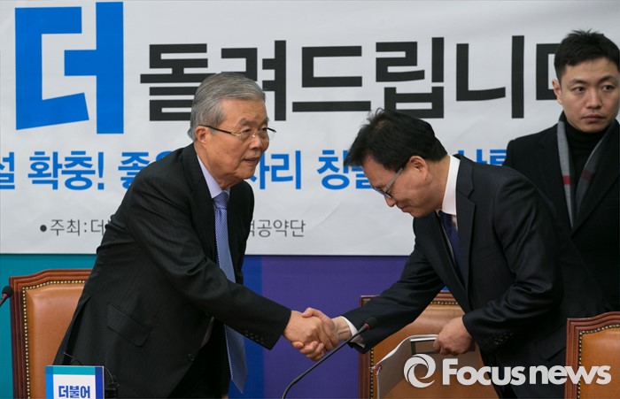 (서울=포커스뉴스) 김종인(왼쪽) 더불어민주당 비대위 대표가 4일 오전 서울 여의도 국회에서 열린 '국민연금 혜택, 국민께 더 돌려드리겠습니다 - 정책공약단 공약발표'에 참석해 박광온 의원과 인사하고 있다.