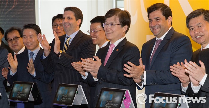 (서울=포커스뉴스) 4일 오전 서울 종로구 한국마이크로소프트에서 열린 '사이버보안센터 개관식'에서 마크 리퍼트(왼쪽 네번째) 주한미대사, 최양희(왼쪽 여섯번째부터) 미래창조과학부 장관, 세자르 세르누다 마이크로소프트 아시아태평양 지역 사장을 비롯한 참석자들이 디지털 테이프 커팅을 마치고 박수를 치고 있다.