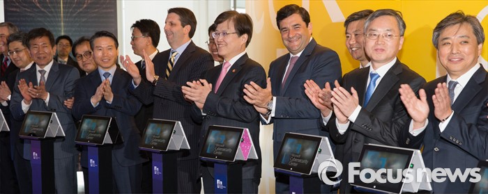 (서울=포커스뉴스) 4일 오전 서울 종로구 한국마이크로소프트에서 열린 '사이버보안센터 개관식'에서 마크 리퍼트(왼쪽 일곱번째부터) 주한미대사, 최양희 미래창조과학부 장관, 세자르 세르누다 마이크로소프트 아시아태평양 지역 사장을 비롯한 참석자들이 디지털 커팅을 마치고 박수를 치고 있다.