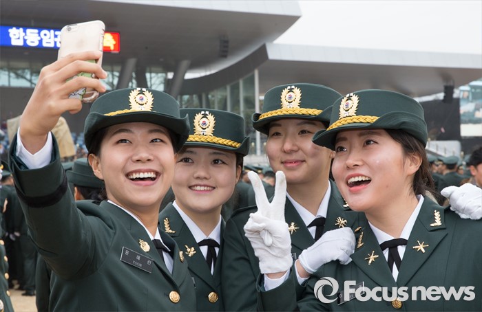 (계룡=포커스뉴스) 4일 오전 충남 계룡대 연병장에서 열린 2016년 장교 합동임관식 리허설에서 신임장교들이 셀카를 찍고 있다.