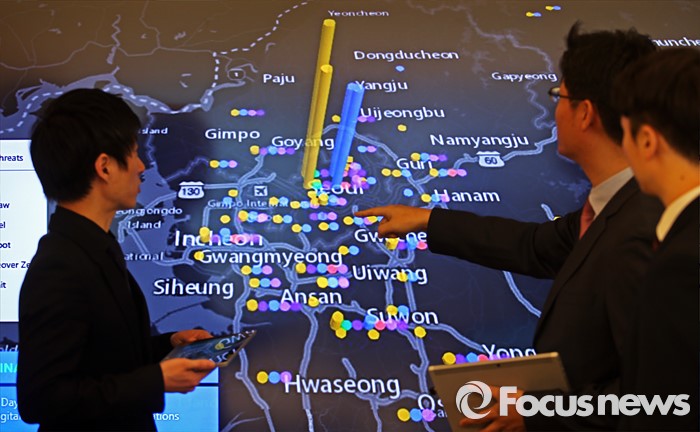 (서울=포커스뉴스) 한국마이크로소프트 사이버보안센터 오픈식이 열린 4일 오전 서울 종로구 더케이트원타워에서 관계자들이 악성코드 분포도를 확인하고 있다.