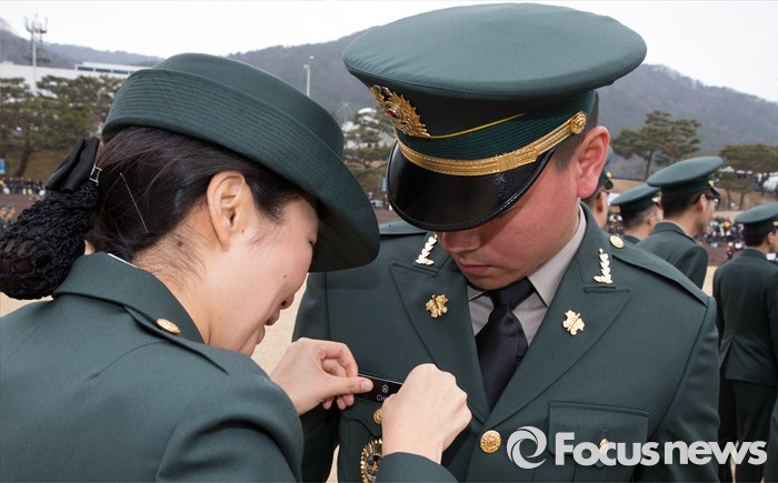 (계룡=포커스뉴스) 4일 오전 충남 계룡대 연병장에서 열린 2016년 장교 합동임관식 리허설에서 신임장교가 명찰을 달아주고 있다.
