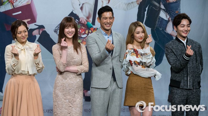 (서울=포커스뉴스)4일 오후 서울 마포구 상암동 MBC 신사옥에서 열린 MBC 드라마 '마이 리틀 베이비' 제작발표회에서 출연진들이 취재진을 향해 손가락 하트를 만들어 보이고 있다.(왼쪽부터 배우 정수영, 배우 이수경, 배우 오지호, 걸그룹 포미닛 멤버 남지현, 배우 김민재)