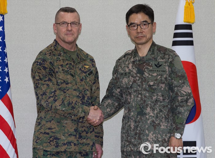 (서울=포커스뉴스) 4일 오후 서울 용산구 국방부에서 열린 주한미군의 사드 배치문제를 협의하기 위한 한·미 공동실무단 첫 회의에서 한국측 대표인 장경수 국방부 정책기획관과 미국측 대표인 헤드룬드 주한미군사령부 기획참모부장이 악수를 하고 있다.
