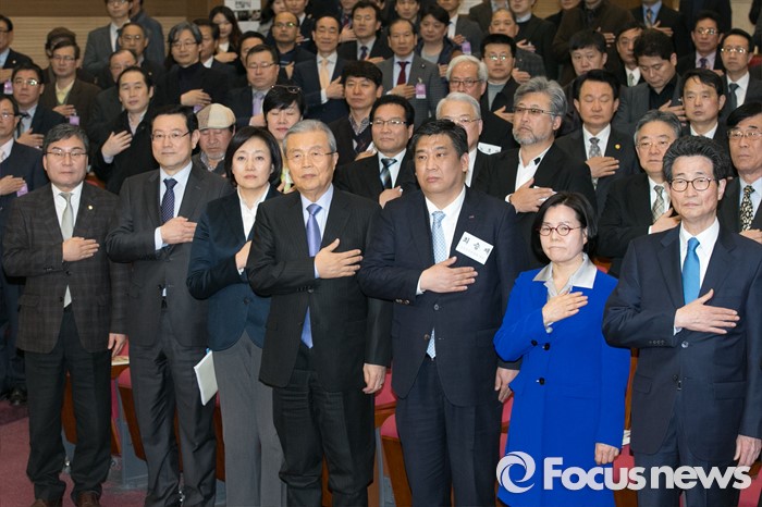 (서울=포커스뉴스) 김종인(앞줄 가운데) 더불어민주당 비대위 대표를 비롯한 참석자들이 4일 오후 서울 여의도 국회 의원회관에서 열린 소상공인 20대 총선 정책공약 전달식에 참석해, 국민의례를 하고 있다. 앞줄 오른쪽부터 이목희 정책위의장, 전순옥 의원,최승재 소상공인연합회 회장, 김 대표, 박영선 비대위원, 이용섭 비대위원.
