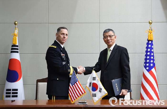 (서울=포커스뉴스) 4일 오전 서울 용산구 국방부에서 류제승 정책실장과 토마스 밴달 미8군 사령관 겸 주한미군사령부 참모장이 주한미군의 사드 배치를 협의하기 위한 한·미 공동실무단 구성 관련 약정에 서명을 하고 있다. <사진제공=국방부>