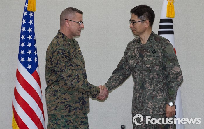 (서울=포커스뉴스) 4일 오후 서울 용산구 국방부에서 열린 주한미군의 사드 배치문제를 협의하기 위한 한·미 공동실무단 첫 회의에서 한국측 대표인 장경수 국방부 정책기획관과 미국측 대표인 헤드룬드 주한미군사령부 기획참모부장이 악수를 하고 있다.