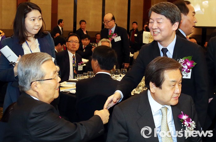 (서울=포커스뉴스) 김종인(왼쪽) 더불어민주당 비대위 대표와 안철수(오른쪽) 국민의당 상임공동대표가 4일 오후 서울 강남구 프리마호텔에서 열린 전국호남향우회 정기총회에 참석해 인사하고 있다. 오른쪽 아래는 김무성 새누리당 대표.
