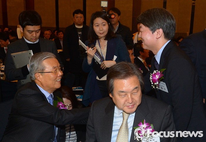 (서울=포커스뉴스) 4일 오후 서울 강남구 프리마호텔에서 열린 전국호남향우회 정기총회에 참석한 김종인(왼쪽) 더불어민주당 비상대책위원회 대표와 안철수(오른쪽) 국민의당 상임공동대표가 만나 인사하고 있다. 가운데는 김무성 새누리당 대표.