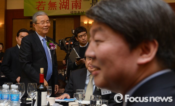 (서울=포커스뉴스) 4일 오후 서울 강남구 프리마호텔에서 열린 전국호남향우회 정기총회에 참석한 김종인(왼쪽) 더불어민주당 비상대책위원회 대표와 안철수 국민의당 상임공동대표가 만나 인사한 뒤 자리로 돌아가고 있다.
