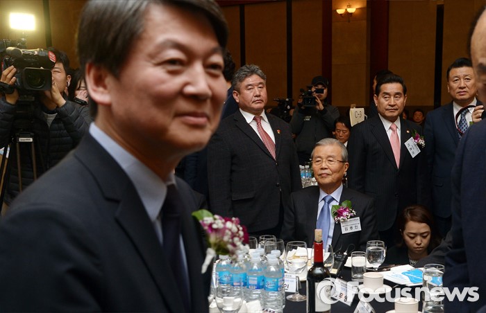 (서울=포커스뉴스) 4일 오후 서울 강남구 프리마호텔에서 전국호남향우회 정기총회에 참석한 김종인(오른쪽) 더불어민주당 비대위 대표와 안철수 국민의당 상임공동대표가 내빈들과 인사 후 자리로 향하고 있다.