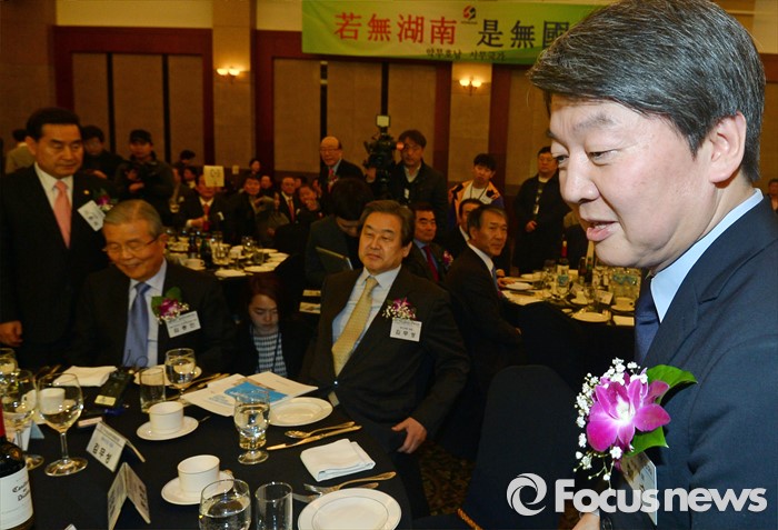 (서울=포커스뉴스) 4일 오후 서울 강남구 프리마호텔에서 열린 전국호남향우회 정기총회에 참석한 김종인(왼쪽) 더불어민주당 비상대책위원회 대표와 안철수(오른쪽) 국민의당 상임공동대표가 만나 인사한 뒤 자리로 돌아가고 있다. 가운데는 김무성 새누리당 대표.
