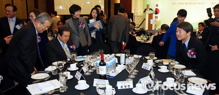 (서울=포커스뉴스) 김무성(가운데) 새누리당 대표, 김종인(왼쪽) 더불어민주당 비대위 대표, 안철수 국민의당 상임공동대표가 4일 오후 서울 강남구 프리마호텔에서 열린 전국호남향우회 정기총회에 참석해 자리하고 있다.