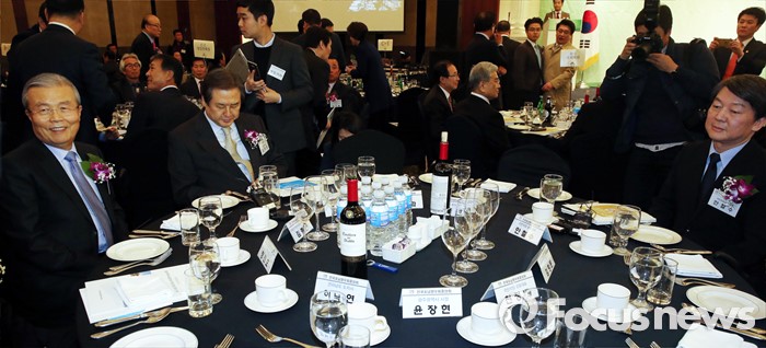 (서울=포커스뉴스) 김무성(가운데) 새누리당 대표, 김종인(왼쪽) 더불어민주당 비대위 대표, 안철수 국민의당 상임공동대표가 4일 오후 서울 강남구 프리마호텔에서 열린 전국호남향우회 정기총회에 참석해 자리하고 있다.