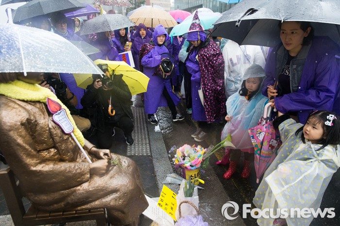 (서울=포커스뉴스) 5일 오후 세계여성의날(3월8일) 기념 제32회 한국여성대회를 마친 참가자들이 서울 종로구 일본대사관 앞에서 소녀상을 바라보고 있다.