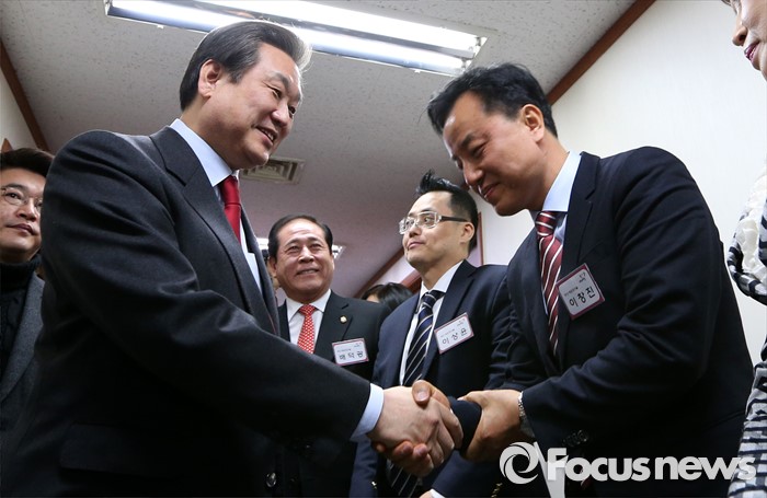 (서울=포커스뉴스) 부산 중구·영도구에 출마하는 김무성 새누리당 대표가 6일 오전 서울 여의도 당사에 마련된 공천 심사 면접장 앞에서 예비후보들과 인사를 나누고 있다.