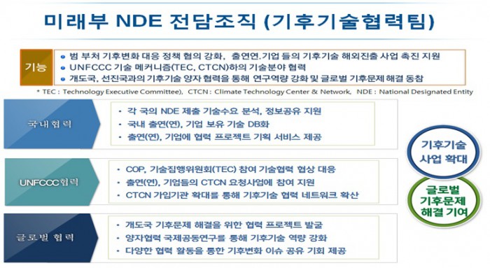 미래부는 NDE로서 기후변화협약하에서 기후변화협약(UNFCCC)와의 협력, 출연연·기업들의 기후기술 해외진출 사업 촉진, 국가 간 협력을 통해 기후문제해결과 기후기술 역량을 강화시키는 다양한 활동을 펴나갈 계획이다.