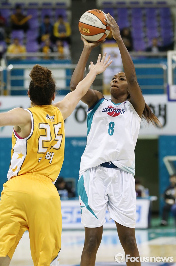 (부천=포커스뉴스) 6일 부천체육관에서 열린 2015-2016 여자프로농구 KEB하나은행-KB스타즈 경기에서 KEB하나 버니스 모스비가 KB스타즈 햄비의 블록을 피해 점프슛을 쏘고 있다.