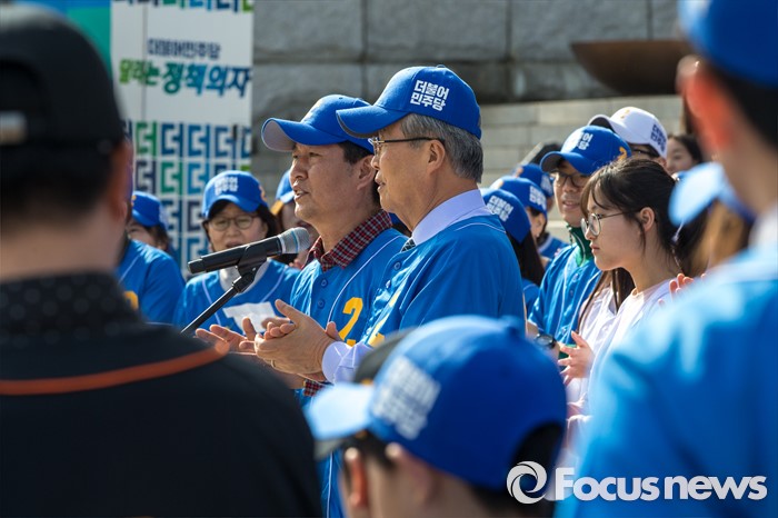 (서울=포커스뉴스) 김종인 더불어민주당 비상대책위원회 대표와 정청래 더불어민주당 의원을 비롯한 당원들이 6일 오후 서울 영등포구 국회 본관 앞에서 열린 '더불어민주당 총선 응원가 뮤직비디오 촬영'에 참여해 응원가를부르고 있다.