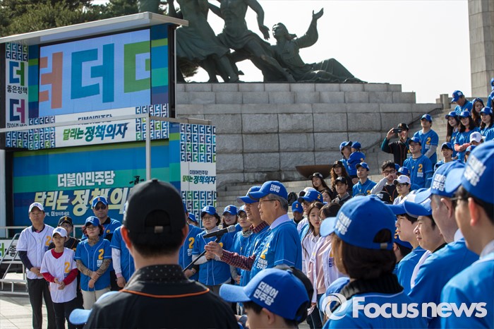 (서울=포커스뉴스) 김종인 더불어민주당 비상대책위원회 대표와 정청래 더불어민주당 의원을 비롯한 당원들이 6일 오후 서울 영등포구 국회 본관 앞에서 열린 '더불어민주당 총선 응원가 뮤직비디오 촬영'에 참여해 응원가를부르고 있다.