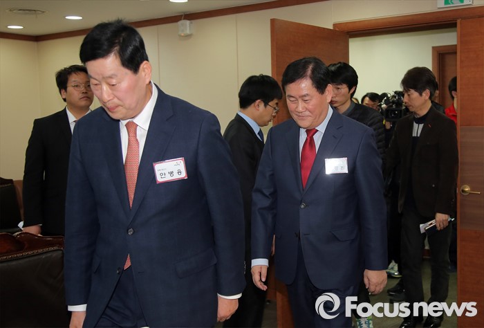 (서울=포커스뉴스) 새누리당 최경환 의원이 6일 오후 서울 여의도 당사에서 열린 경북 경산 공천면접에 안병용 예비후보(왼쪽)와 함께 참석하고 있다.