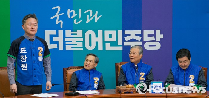(서울=포커스뉴스) 20대 총선 경기 용인정에 전략공천된 표창원(왼쪽 첫번째) 더불어민주당 비대위원이 7일 오전 서울 여의도 국회에서 비상대책위원회의에 앞서 20대 총선용 유니폼을 입고 취재진에게 소개하고 있다. 왼쪽부터 표 비대위원, 우윤근 비대위원, 김종인 비대위 대표, 이종걸 원내대표.