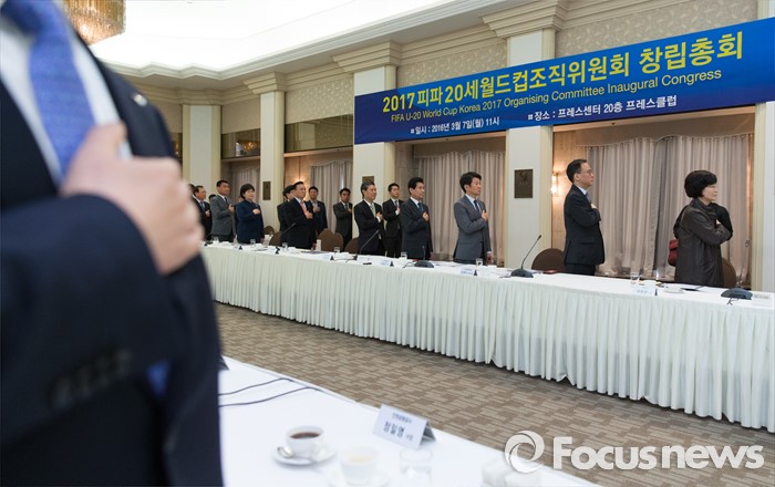 (서울=포커스뉴스) 7일 오전 서울 중구 프레스센터에서 2017 피파 20세 월드컵조직위원회 창립총회에 참석한 정몽규 대한축구협회장과 위원들이 국민의례를 하고 있다.