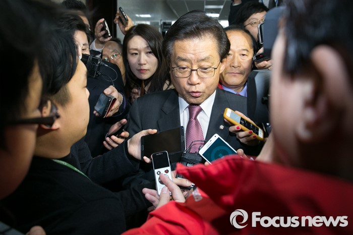 (서울=포커스뉴스) 공천 탈락 통보를 받은 김태환 새누리당 의원이 7일 오전 서울 여의도 국회에서 열린 최고위원회의에 참석한 뒤, 기자들의 질문에 답하며 밖으로 나가고 있다.