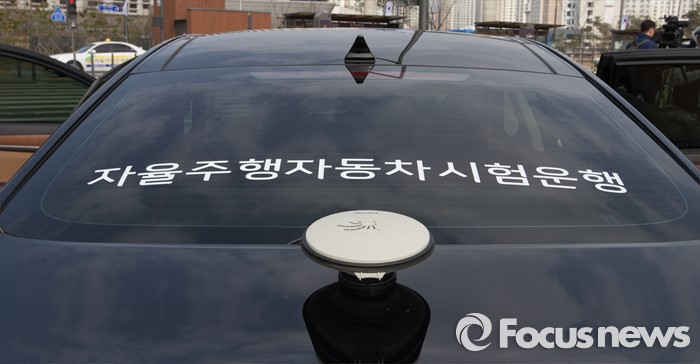 (세종=포커스뉴스) 7일 오전 세종시 정부세종청사 국토교통부 앞에서제1호 자율주행차 시험운행 허가 및 시연이 열린 가운데 현대 제네시스가 국내 자율주행차 임시운행 제1호차로 허가받고 도로주행을 시작했다.