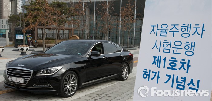(세종=포커스뉴스) 7일 오전 세종시 정부세종청사 국토교통부 앞에서제1호 자율주행차 시험운행 허가 및 시연이 열린 가운데 현대 제네시스가 국내 자율주행차 임시운행 제1호차로 허가받고 도로주행을 시작했다. 사진은 자율주행 시험차량.
