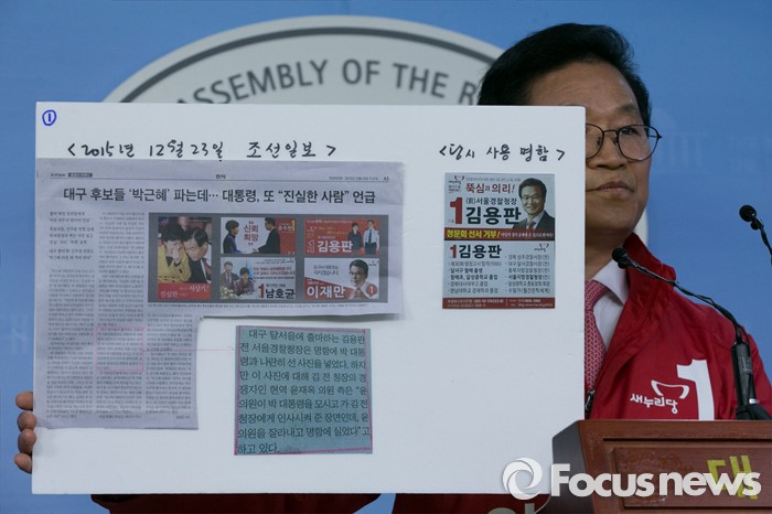 (서울=포커스뉴스) 김용판 새누리당 대구 달서을 예비후보가 7일 오전 서울 여의도 국회 정론관에서 자신을 총선 부적격자에 올린 '2016총선넷' 주장 반박, 국정원 여직원 댓글 사건으로 재판 중인 권은희 국민의당 의원 규탄, 윤재옥 의원의 음해성 행동 및 갑질 중단 등 기자회견을 하고 있다.
