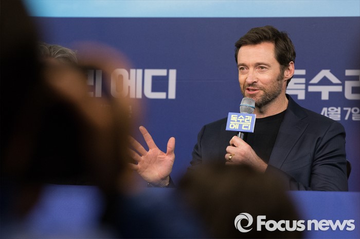 (서울=포커스뉴스) 7일 오전 서울 종로구 포시즌스 호텔 서울에서 열린 영화 '독수리 에디' 기자간담회에 배우 휴잭맨이 참석해 취재진 질문에 답하고 있다.