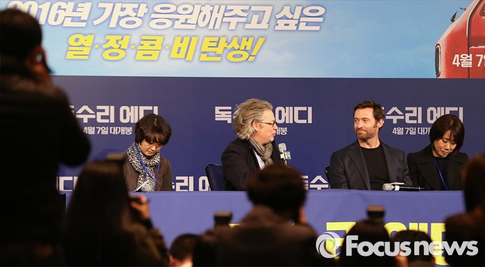 (서울=포커스뉴스) 7일 오전 서울 종로구 포시즌스 호텔 서울에서 열린 영화 '독수리 에디' 기자간담회에 참석한 영화 감독 덱스터 플레처(왼쪽 두번째)가 인사말을 하고 있다.