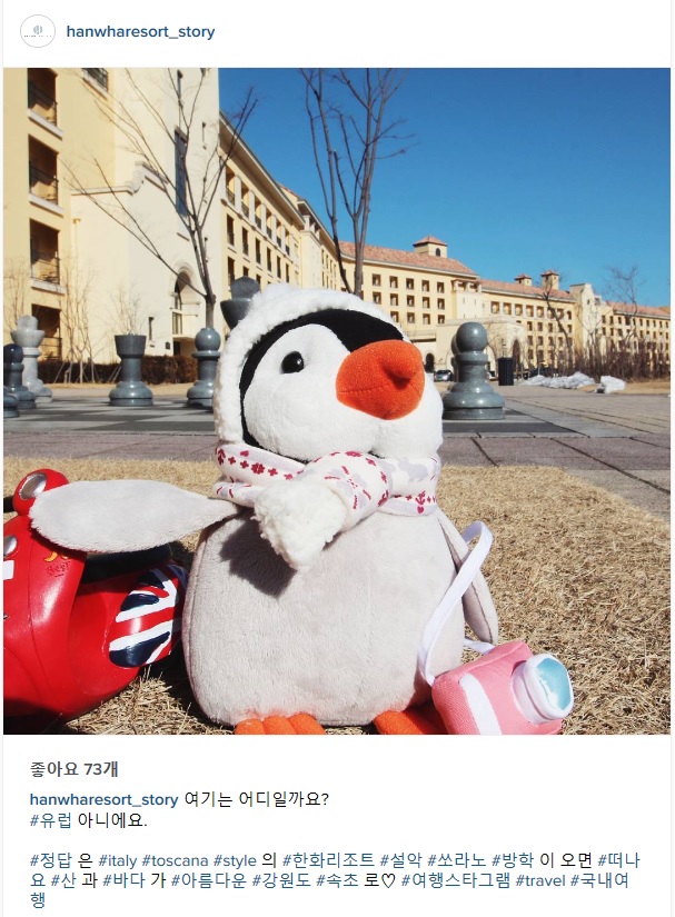 한화리조트 관계자는 "펭귄 '포리'가 전국을 관광하는 콘셉트로 여행에 관심이 많은 2030세대와 더욱 적극적으로 소통할 것"이라고 밝혔다.한화리조트는 공식 인스타그램 '한화리조트-스토리'를 개설했다.<사진제공=한화리조트>