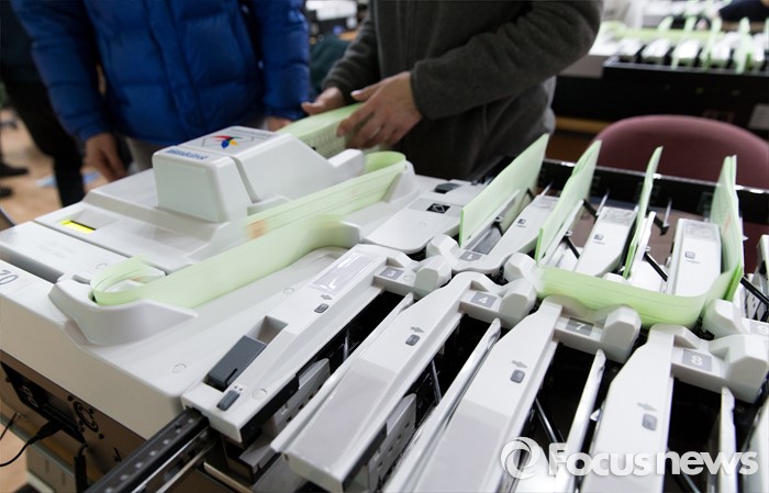 (서울=포커스뉴스) 제20대 총선을 한 달여 앞둔 7일 오후 서울 종로구 중앙선거관리위원회 선거연수원에서 투표지 분류기 담당자들이 장비점검 및 개표관리 실습교육을 하고 있다.