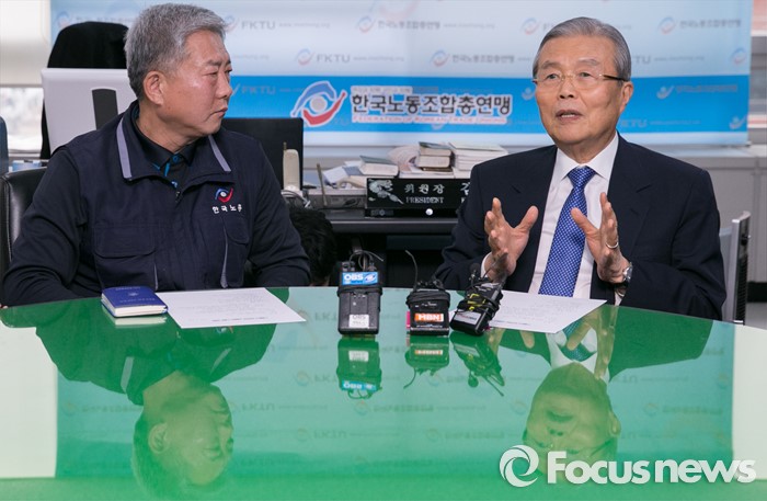 (서울=포커스뉴스) 김종인(오른쪽) 더불어민주당 비대위 대표가 7일 오후 서울 영등포구 한국노동조합총연맹을 방문해 김동만 위원장과 대화하고 있다.