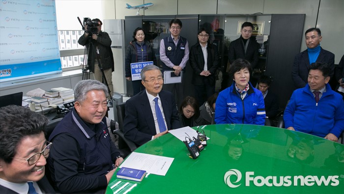 (서울=포커스뉴스) 김종인(오른쪽 세번째) 더불어민주당 비대위 대표가 7일 오후 서울 영등포구 한국노동조합총연맹을 방문해 김동만(왼쪽 두번째) 위원장과 대화하고 있다.